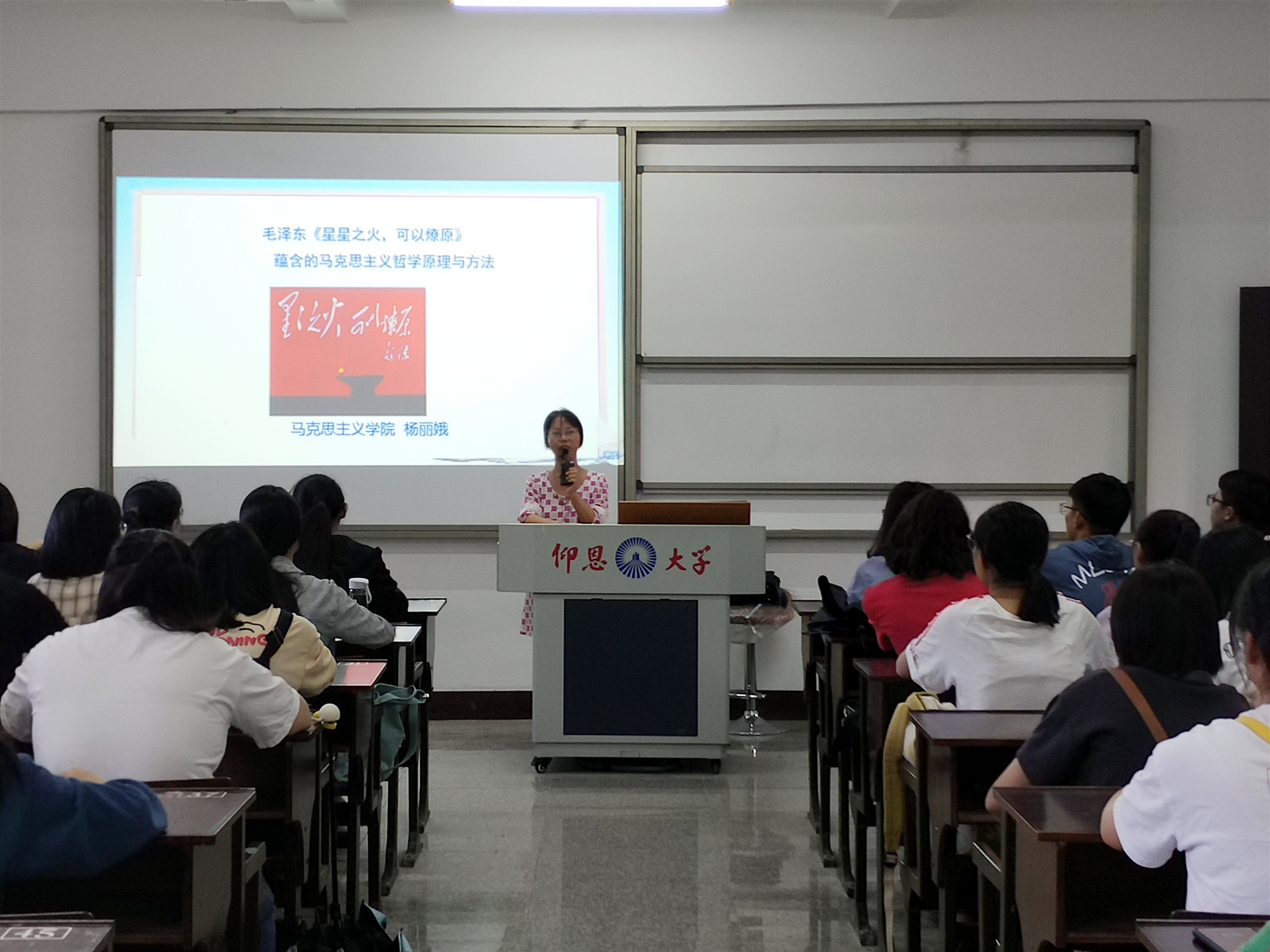 杨丽娥从《星星之火,可以燎原》一文的写作背景、主要内容以及文章蕴含的马克思主义哲学原理与方法等三个层面开展了这次专题讲座。她在结合史实的基础上,分析了毛泽东这一文章的写作背景与主要内容,进而归纳出要遵循物质决定意识的原理,坚持一切从实际出发的方法,正确看待现象与本质、量变与质变和矛盾分析法。