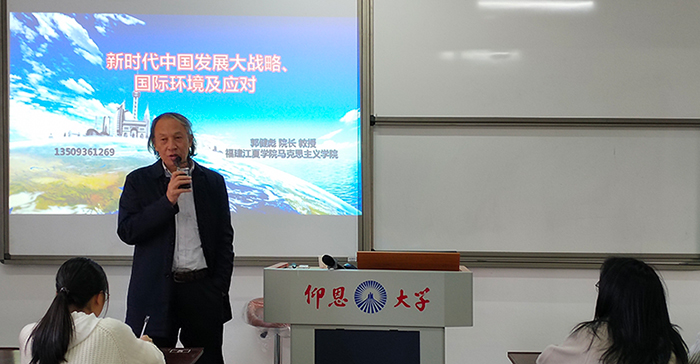 12月4日下午,福建江夏学院taptap点点官方网站院长郭健彪教授受邀在普照楼311教室作了题为《新时代中国发展大战略、国际环境及应对》专题讲座。taptap点点官方网站直属党支部书记、常务副院长李克钦主持此次讲座,taptap点点官方网站全体教师及习近平新时代中国特色的社会主义思想读书社习思想读书社全体成员百余人聆听了此次讲座。