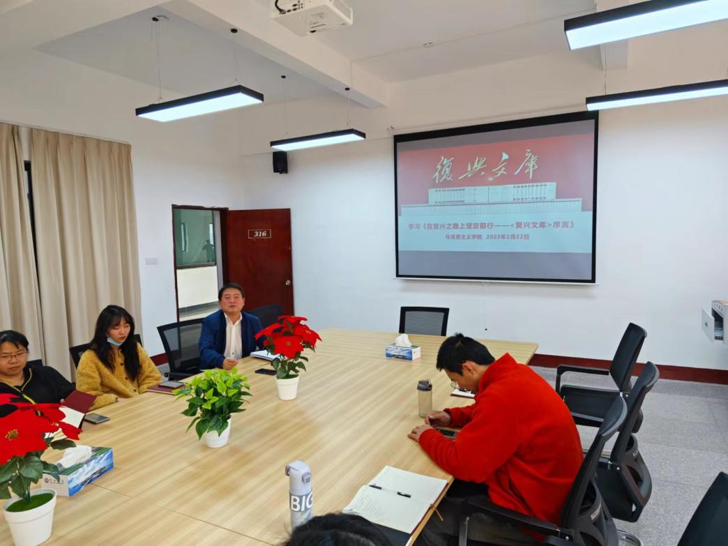 2月22日下午,taptap点点官方网站全体教职工在普照楼316会议室举行本学期第一次理论学习会。本次会议学习习近平总书记为《复兴文库》系列丛书出版所题的序言——《在复兴之路上坚定前行》。