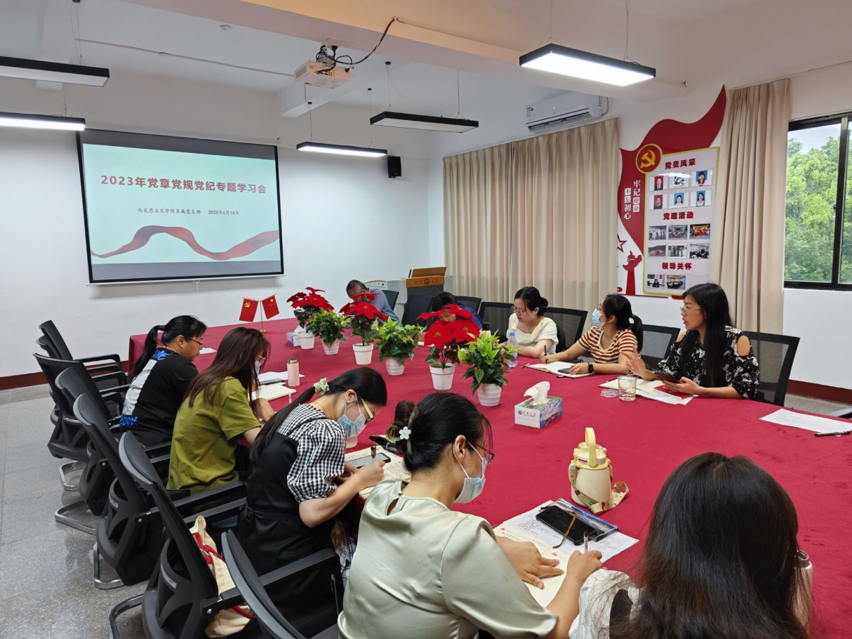 6月14日下午,taptap点点官方网站直属党支部在普照楼316会议室开展2023年党章党规党纪专题学习会,学院全体党员参加,会议由支部宣传委员刘菲同志主持。